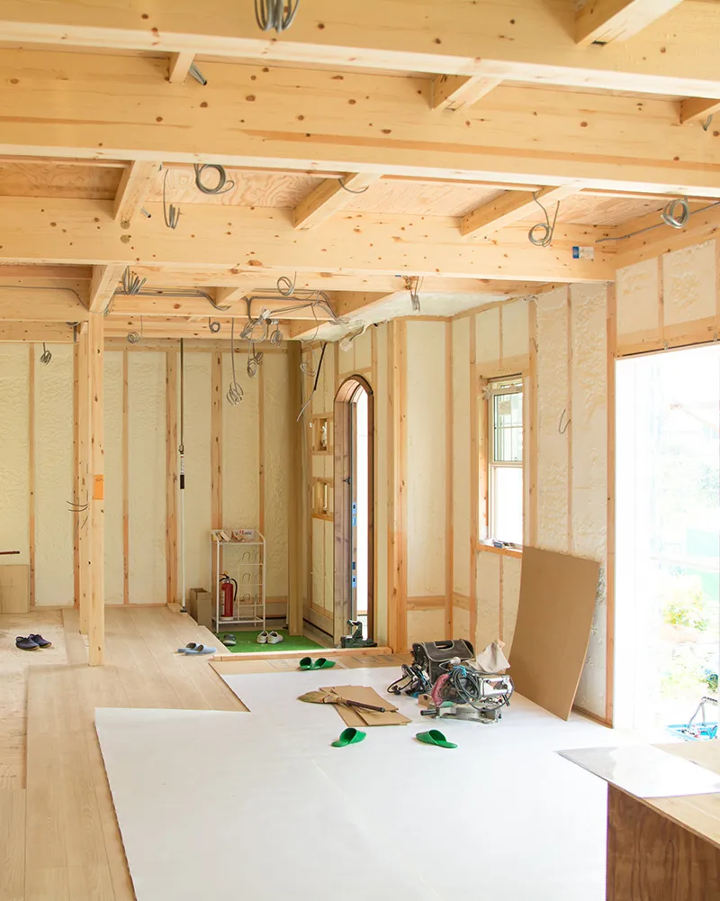 MatsuHomeは、品確法で定められた耐震等級3(消防署や警察署と同等)と耐風等級2同等の最高ランクの性能を標準とし、べた基礎+コーナー補強で強靭な構造を実現。軽くて地震に強いガルバリウム鋼板の屋根と、輻射熱を反射する高性能防水シートで、長く安心できる住まいを提供します。